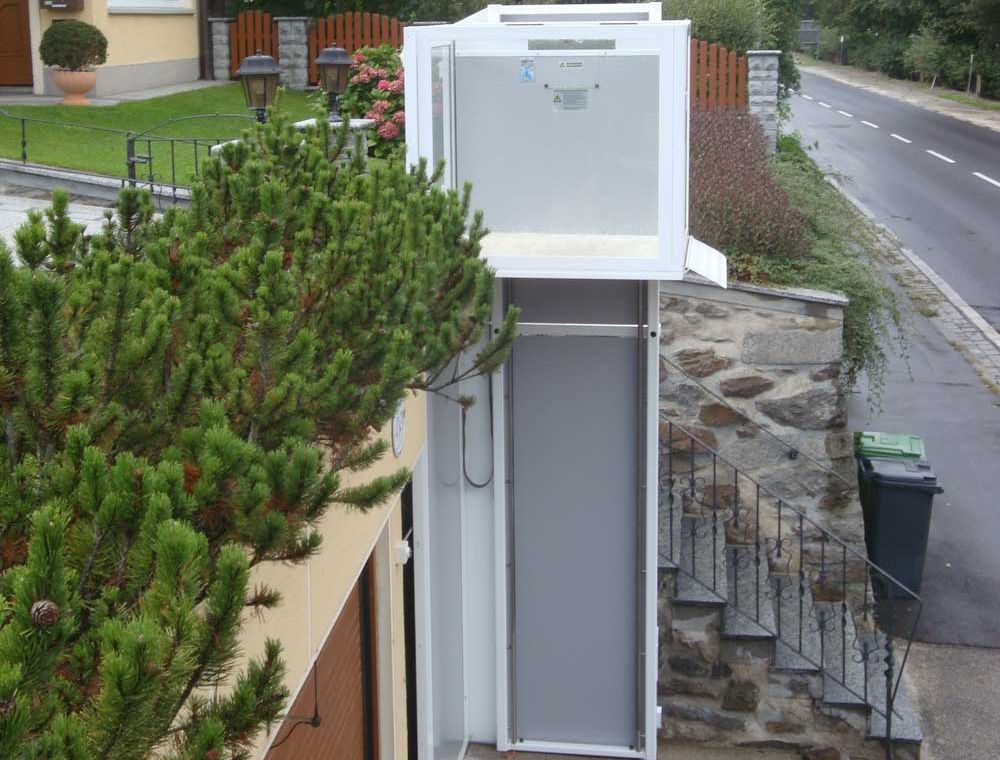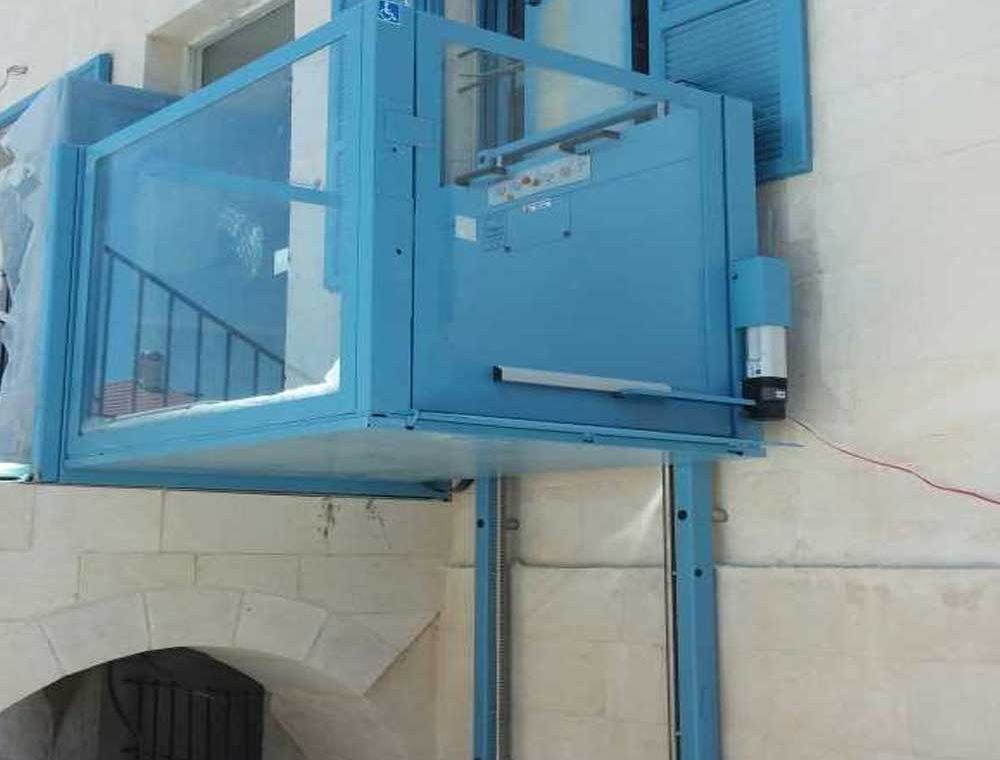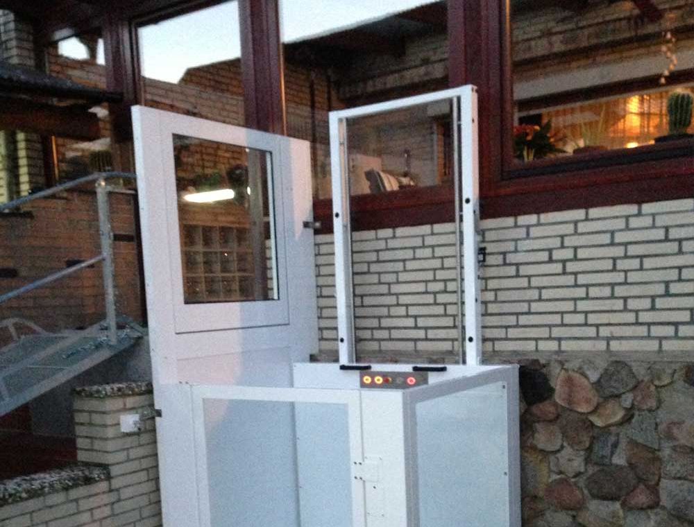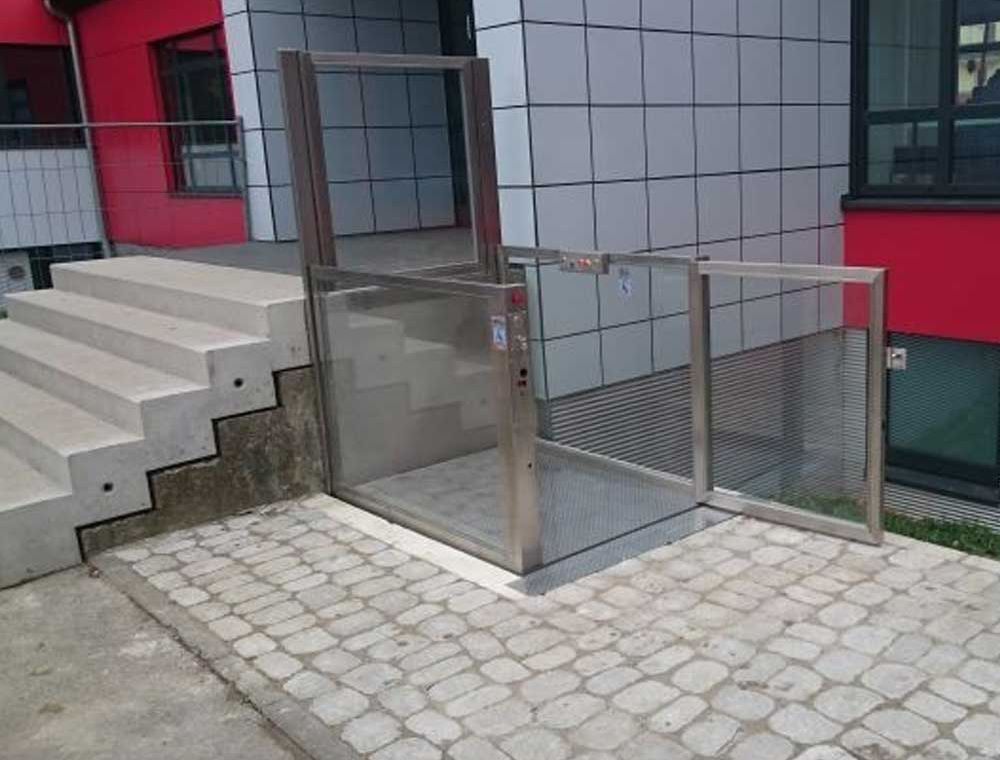 The platform lift has two parts: a vertical rail that is attached to the wall, and the passenger cab that travels up and down the rail.