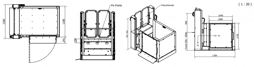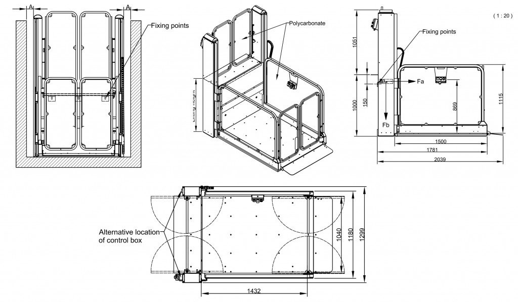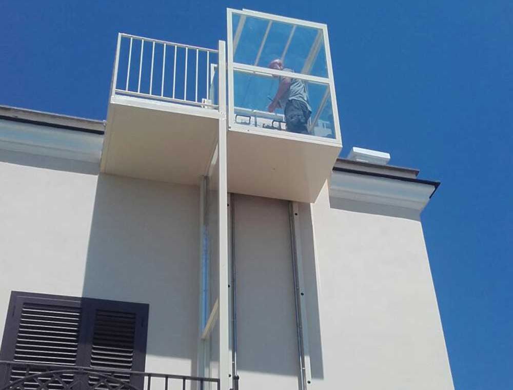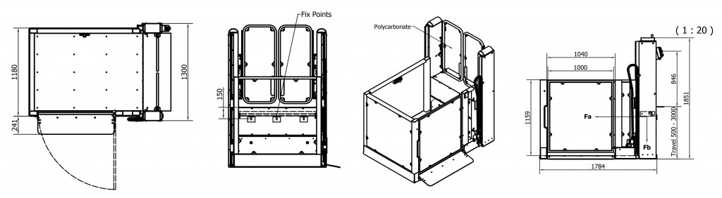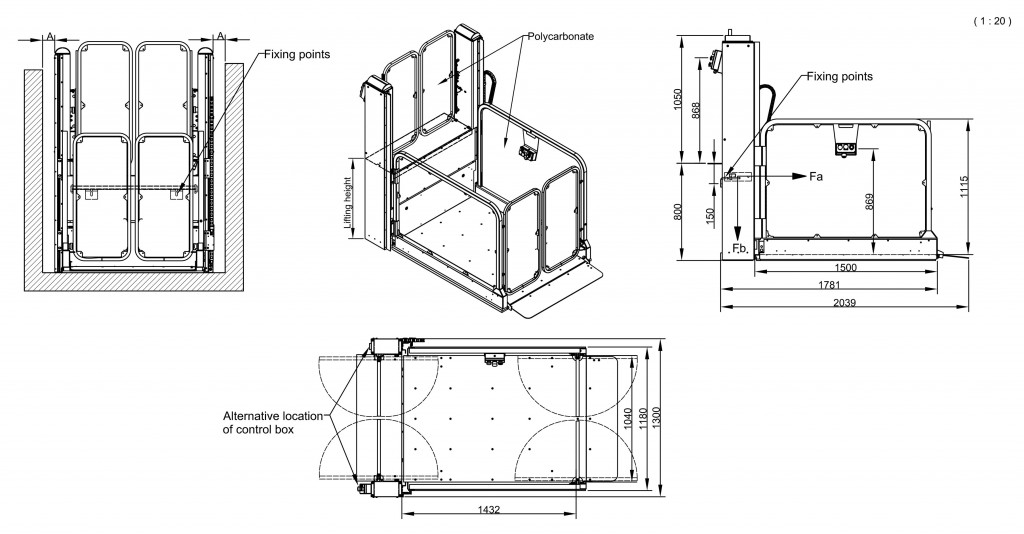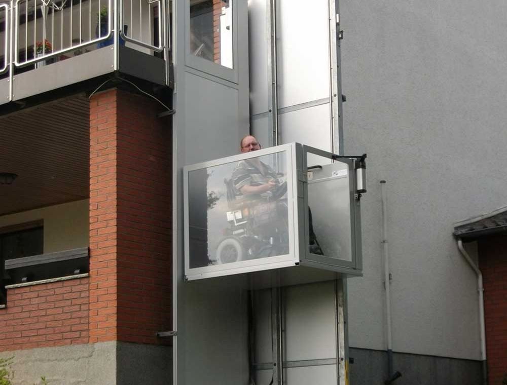 The platform lift has two parts: a vertical rail that is attached to the wall, and the passenger cab that travels up and down the rail.