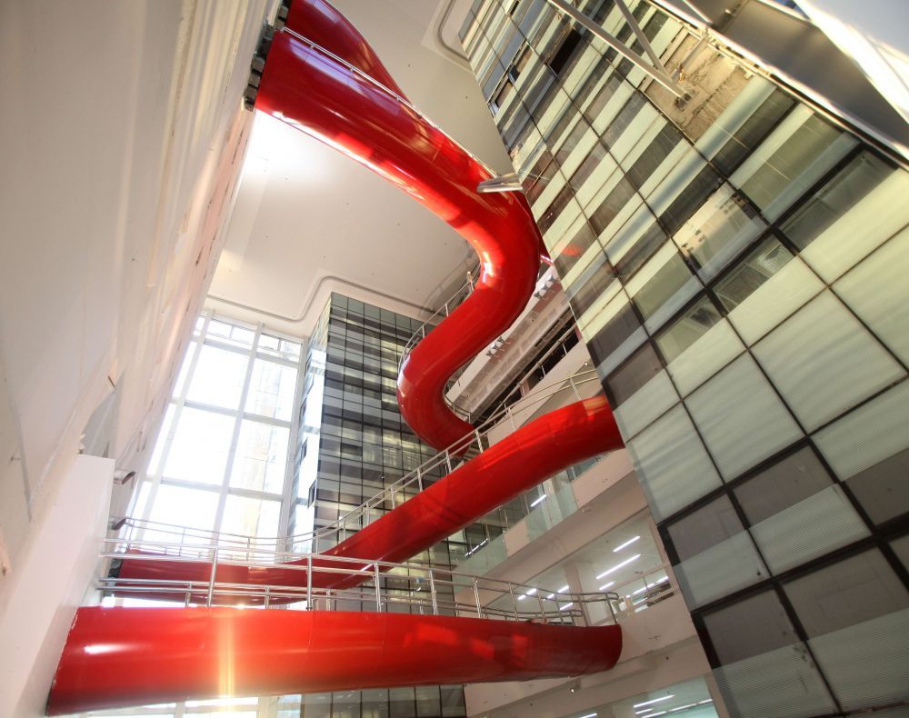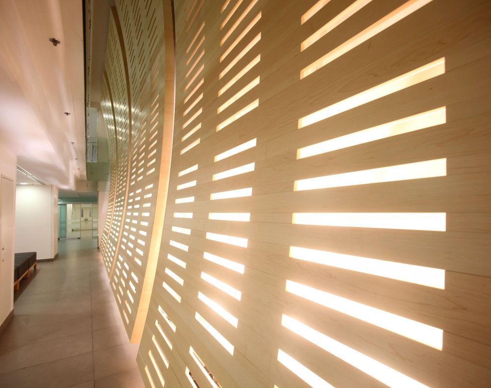 This 11-story inpatient building with 4 additional underground parking levels, includes a cardiology institute, heart health center, operating rooms, research labs, and emergency medical center. During emergencies, the three lowest parking levels can also be converted into a protected 700-bed hospital.